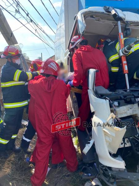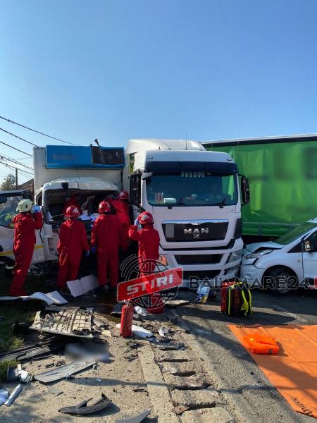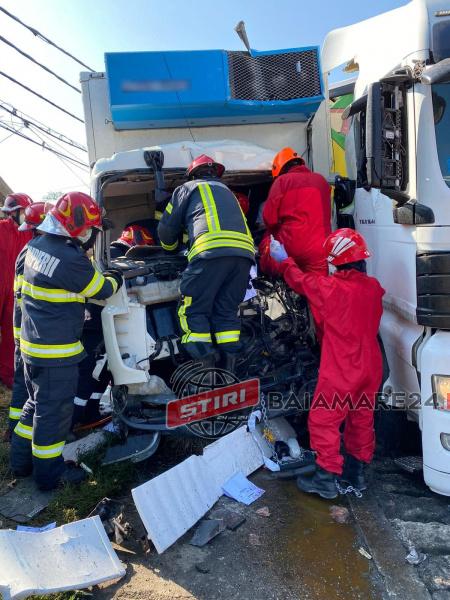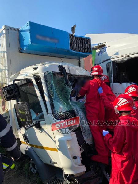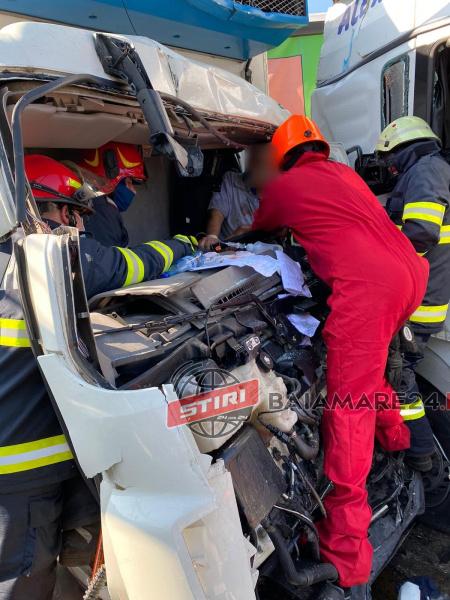 “Două autospeciale cu modul de descarcerare și două echipaje SMURD au fost alertate, în jurul orei 10.00, ca urmare a unui grav accident rutier în care au fost implicate două autotrenuri și un autoturism.