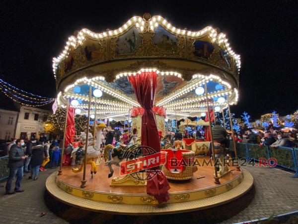 Lângă brad micuții se pot da gratuit într-un carusel, iar Moșul are căsuța lui.