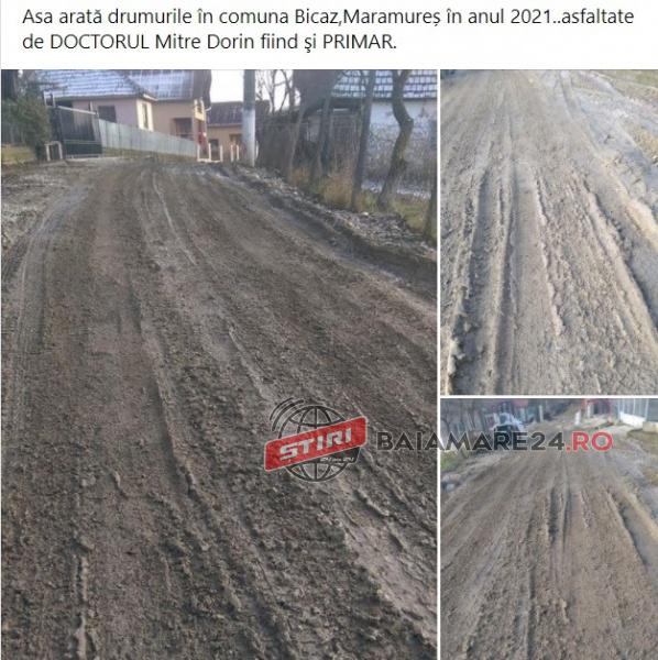 ”Asa arată drumurile în comuna Bicaz,Maramureș în anul 2021… asfaltate de DOCTORUL Mitre Dorin fiind şi PRIMAR” scrie o localnică la fotografiile postate pe rețelele de socializare. Iar comentariile nu au contenit să curgă.