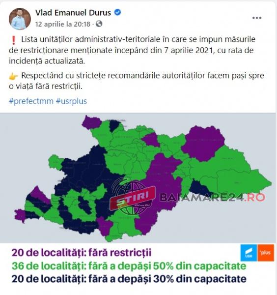 Suntem convinși că șomcutenii au respectat ”cu sfințenie” mesajul postat de tilicarul șef al județului Maramureș, prefectul userist Vlad Emanuel Duruș. ”Lista unităților administrativ-teritoriale în care se impun măsurile de restricționare menționate începând din 16 aprilie 2021, cu rata de incidență actualizată. Respectând cu strictețe recomandările autorităților facem pași spre o viață fără restricții. #prefectmm#usrplus”.