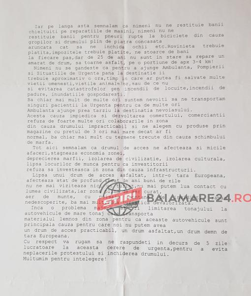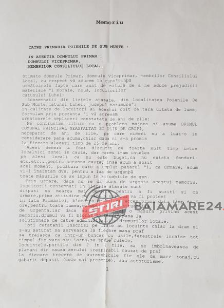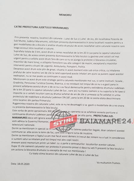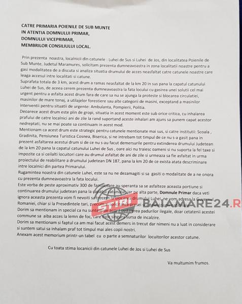 „Prin prezenta localnicii din cătunele: Luhei de Sus și Luhei de Jos (comuna Poienile de Sub Munte) solicităm asfaltarea drului spre cătune. Suprafața totală de 3 km, acest drum a rămas neasfaltat de la km 20 și până la capătul cătunului Luhei de Sus. De aceea cerem prezenta dvs la fața locului cu găsirea unei soluții cel mai urgent pentru a asfalta acest drum. În caz contrar se va ajunge la PROTESTE ȘI BLOCAREA CIRCULAȚIEI, mașinilor de mare tonaj, a utilajelor forestiere sau alte categorii de mașini. Excepție vor fi mașinile de intervenții pentru situații de urgență: Ambulanța, Pompierii, Poliția. (…)
