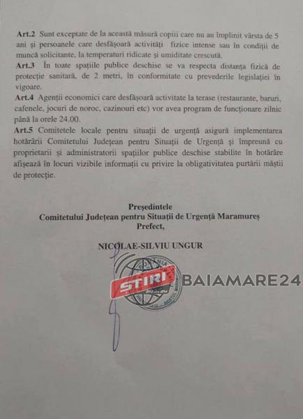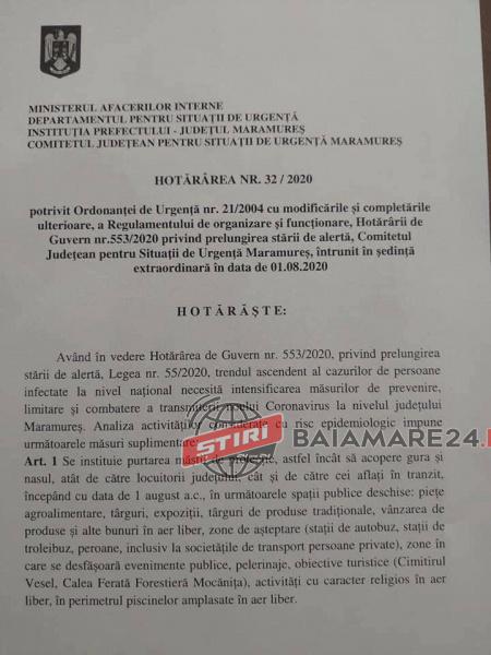 Situație incredibilă la nivelul județului Maramureș. Astăzi, Comitetul Județean pentru Situații de Urgență Maramureș a trimis un comunicat de presă prin care suntem anunțați că în baza Hotărârii 32/2020 că începând de astăzi 1 august 2020 suntem obligați să purtăm mască de protecție și în spațiul liber. Culmea culmilor este că această hotărâre a fost trimisă spre mass-media (sub formă de comunicat) și spre alte instituții ale statului numai că AUTORITĂȚILE au UITAT să o publice în Monitorul Oficial al Județului Maramureș. Așa cum prevede chiar articolul 42 (aliniatul 1) din lege. Cu alte cuvinte suntem obligați să purtăm măști printr-o hotărâre care nefiind publicată NU INTRĂ ÎN VIGOARE.