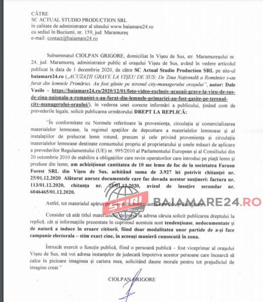 ”Subsemnatul Ciolpan Grigore, domiciliat în Vișeu de Sus… administrator public al orașului Vișeu de Sus, avânt în vedere articolul publicat în data de 1 decembrie 2020 pe site-ul www.baiamare24.ro, în vederea unei corecte informari a publicului, ținând cont de prevederile legale, solicit publicarea următorului DREPT LA REPLICĂ:
