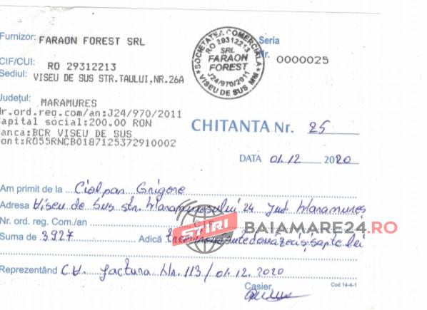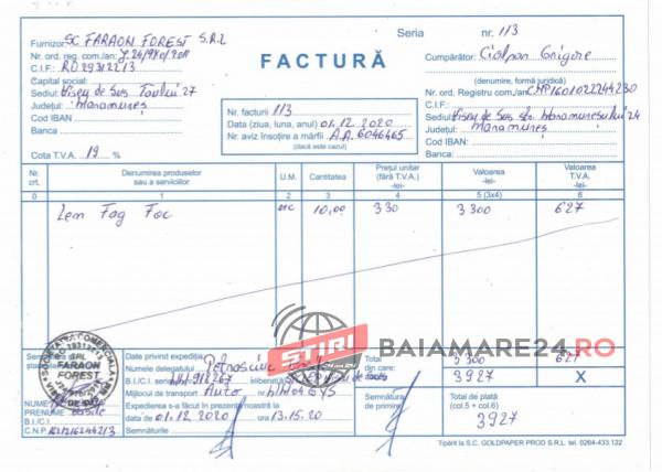 În conformitate cu Normele referitoare la proveniența, circulația și comercializarea materialelor lemnoase, la regimul spațiilor de depozitare a materialelor lemnoase și al instalațiilor de prelucrat lemn rotund, precum și cele privind proveniența și circulația materialelor lemnoase destinate consumului propriu al proprietarului și unele măsuri de aplicare a prevederilor Regulamentului (UE) nr. 995/2010 al Parlamentului European și al Consiliului din 20 octombrie 2010 de stabilire a obligațiilor care revin operatorilor care introduc pe piață lemn și produse din lemn, am achiziționat cantitatea de 10 mc lemn de foc de la societatea Faraon Forest SRL, achitând suma de 3.927 lei, potrivit chitanței nr. 25/01.12.2020 având avizul de însoțire secundar nr. 6046465/01.12.2020.